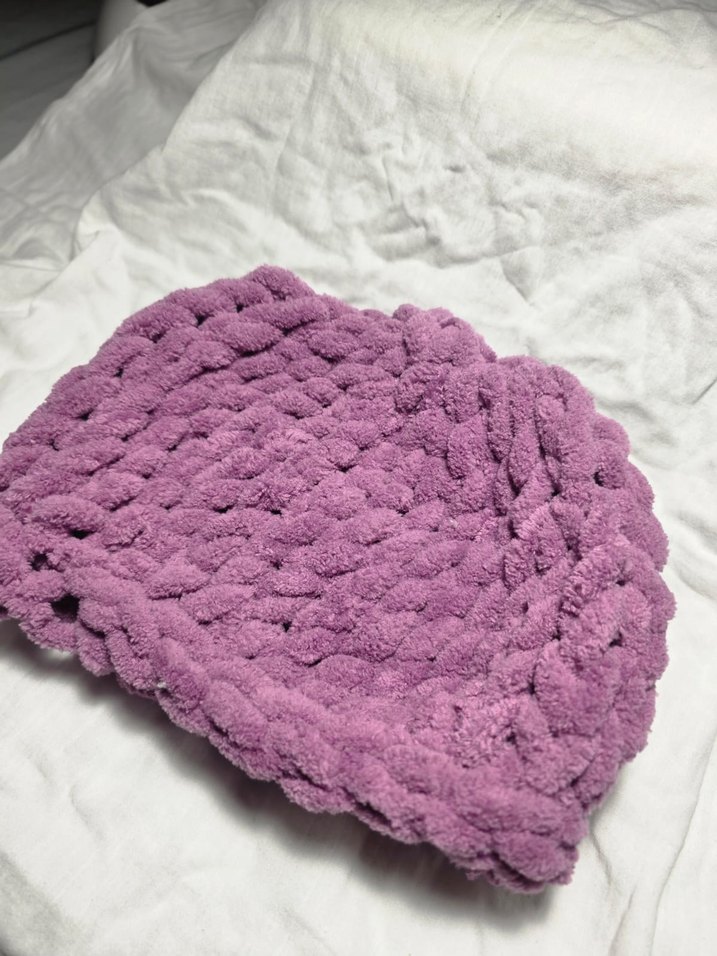 Renkli ve yumuşak dokulu, mor örgü bere. Sıcak tutar ve rahatlık sağlar.