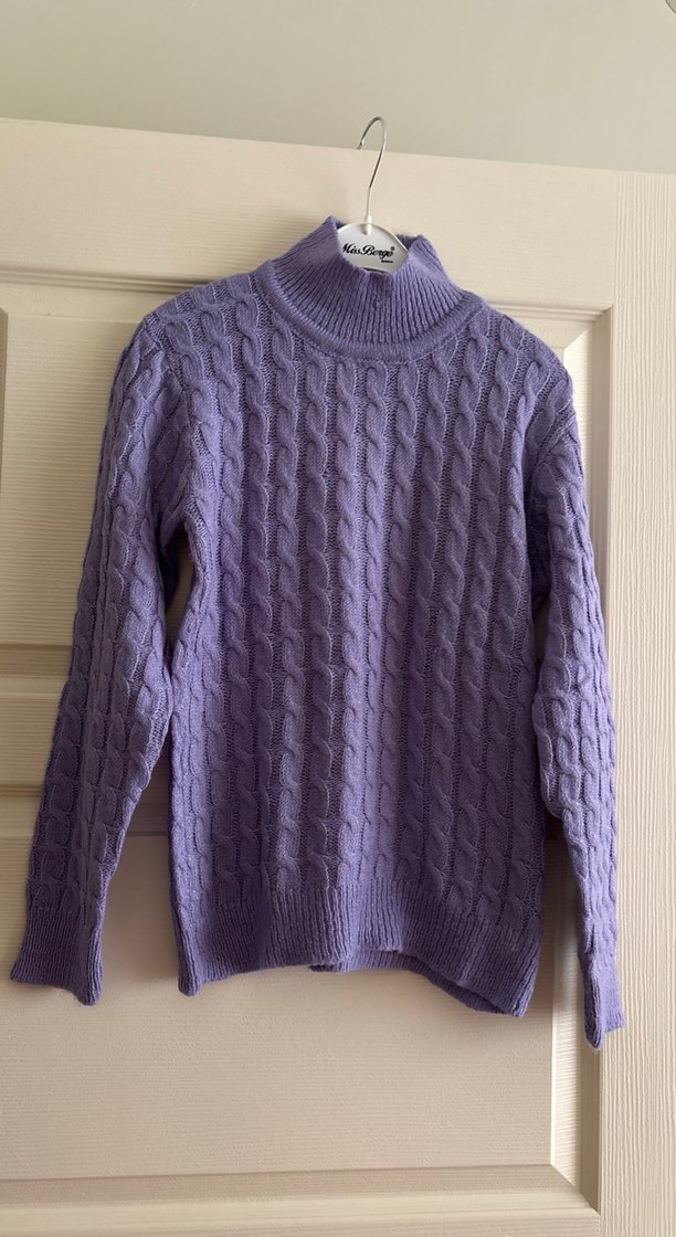 Bu mor örgü kadın kazak, boğazlı ve uzun kolludur. Yumuşak triko malzemeden yapılmış, sade ve normal uzunluktadır. Günlük kullanıma uygundur.