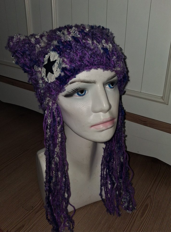 Uzun püsküllü ve yıldız işlemeli koyu mor örgü bohem kadın bere.