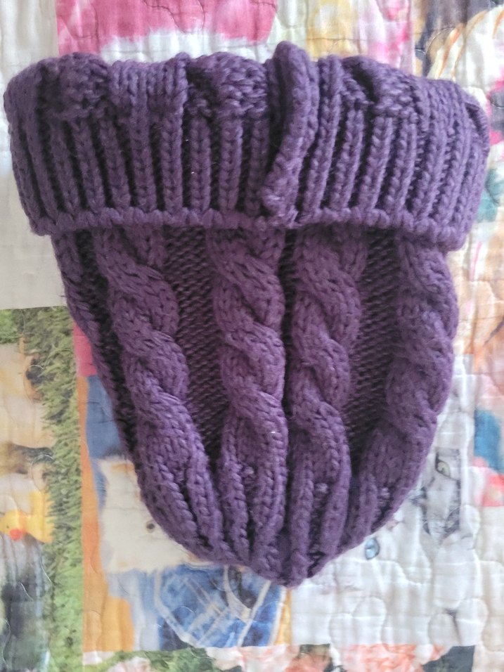Renkli mor örgü kadın bere, kalın örgü dokusuyla sıcak ve rahat bir kullanım sunar. Bohem tarzıyla dikkat çeker.