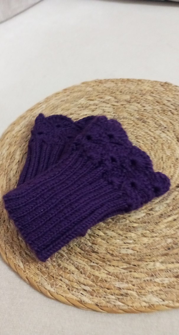 Mor renkli, örgü kadın eldiveni. Rahat ve bohem tarzıyla renkli bir görünüm sunar. El emeği.