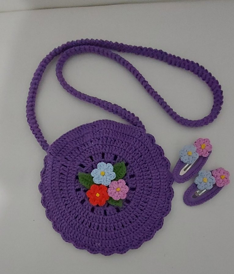 Mor örgü, çiçek desenli bohem çanta ve uyumlu çiçek toka seti. Coton iple örüldü kendi el emeğimdir