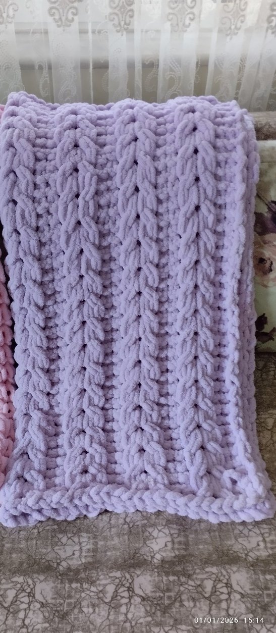 Yumuşak dokulu mor örgü çocuk battaniyesi, çocukları sıcak tutmak için uygundur. Pastel renk yumuşak bir hava katar.