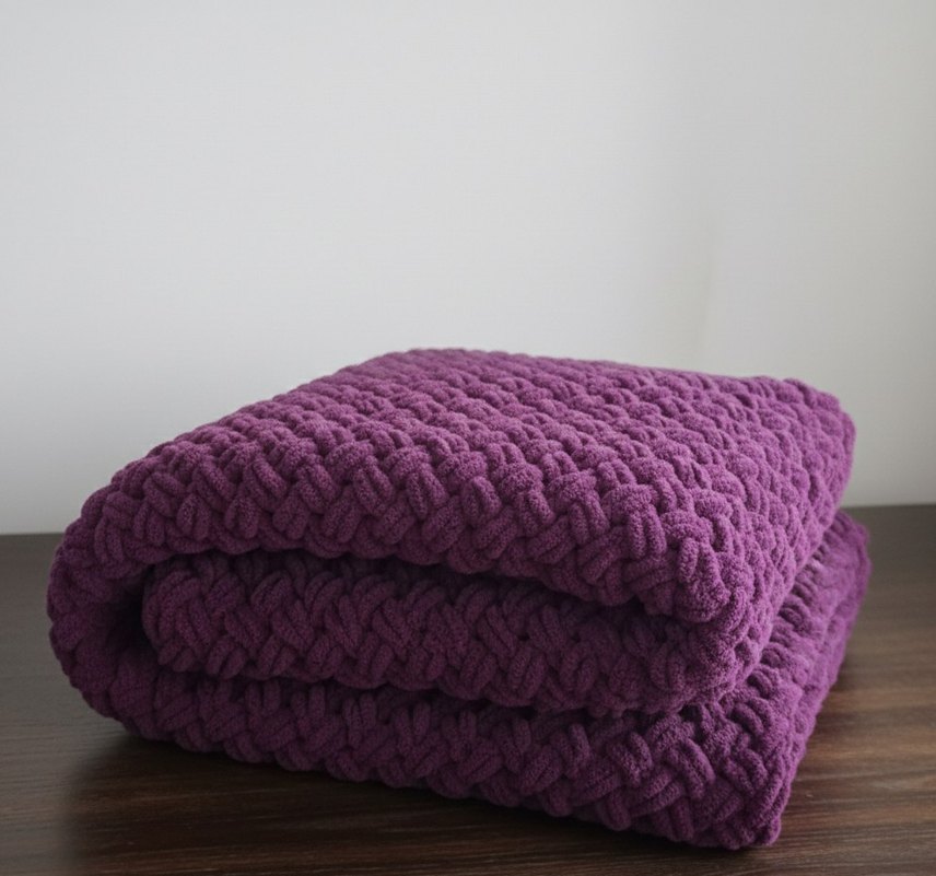 Mor renkli, örgü dokulu çocuk battaniyesi, yumuşak ve rahat kullanıma uygundur.