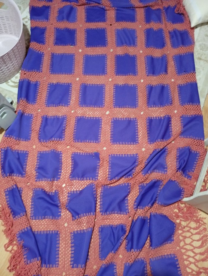Koyu mor renkte, kare desenli ve ince örgü detaylara sahip yumuşak bir battaniyedir. ️el örgüsü yatak örtüsü