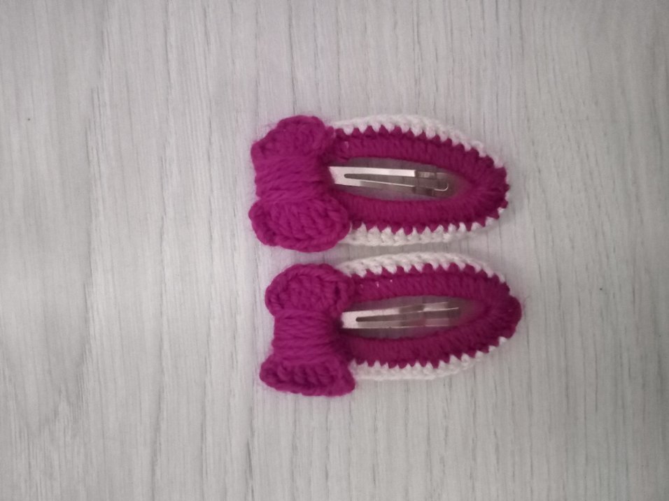 Mor renkli, örgü detaylı ve işlemeli kenarlara sahip, bohem tarzda iki çocuk saç tokası seti.
