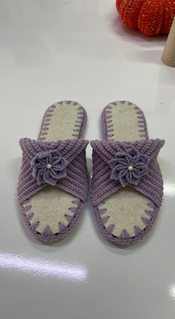 Mor örgü terlikler, çiçek işlemeli detayları ve yumuşak tabanıyla günlük kullanım için uygundur.
