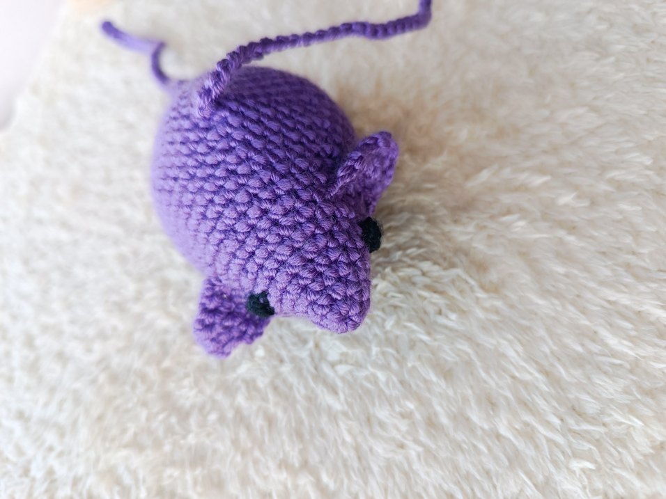Mor renkli, örgü ipten yapılmış küçük fare figürü, detaylı kulak ve gözlere sahip. Kediler için oyuncak.
