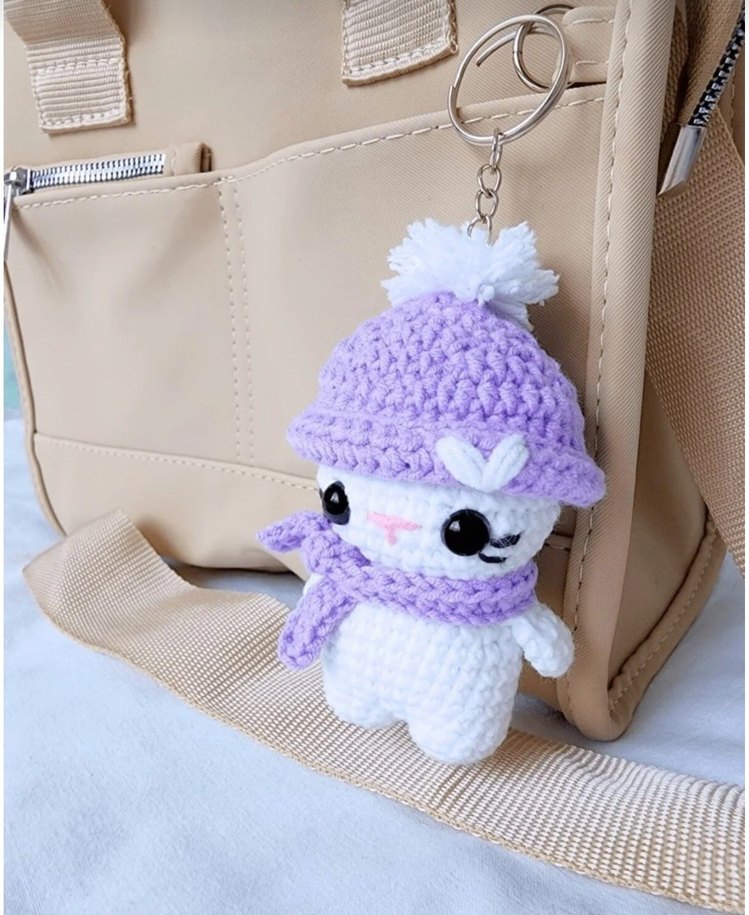 Şapka ve atkı detaylı, pastel mor örgüden yapılmış rahat bir kadın anahtarlık. Anahtarlarınıza veya çantalarınıza şıklık katmak için ideal.