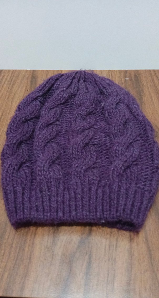Mor renkli, örgü dokusuyla kadın bere. Rahat ve bohem tarzda, sıcak tutan şık bir aksesuar.
