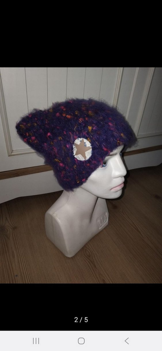 Koyu mor örgü kadın bere, rahat ve bohem tarzda, çiçek detaylı. Yumuşak ve sıcak dokusu ile retro görünüme uygun.