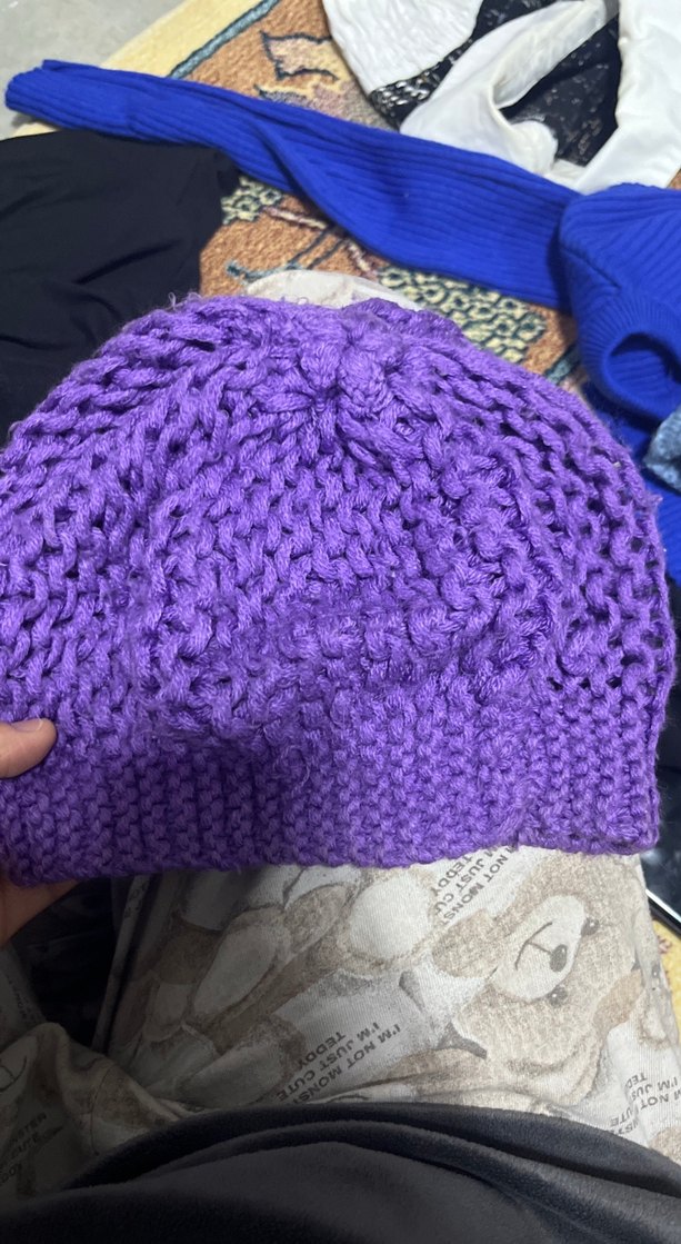Mor renkli kadın bere, yumuşak örgü iplikten yapılmış, soğuk günler için rahat ve renkli bir aksesuardır.