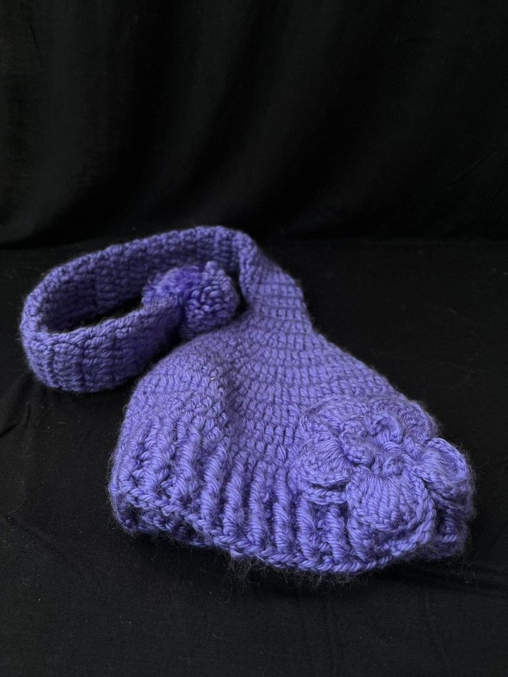 Mor renkli, örgü kadın bere, rahat dokusu ve çiçek detayları ile sade goth tarzına uygun.