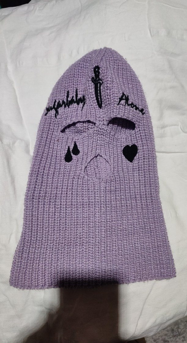 Mor renkli örgü kadın bere, gotik desenlerle süslenmiş. Göz ve ağız için kesikler bulunur, rahat ve punk tarzı bir görünüm sunar.