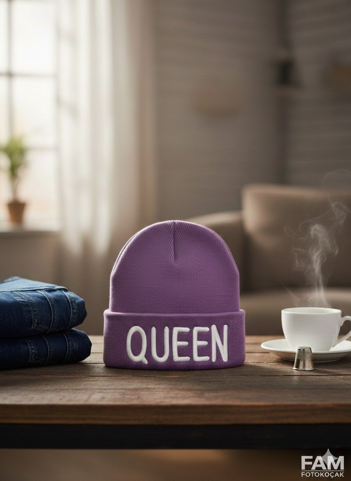 Mor renkli örgü kadın bere, manşetinde 'QUEEN' yazısı bulunur. Rahat, renkli ve bohem retro tarzındadır. Sıcak tutan örgü malzemeden üretilmiştir. 'FAM' yazısı da yer alır.