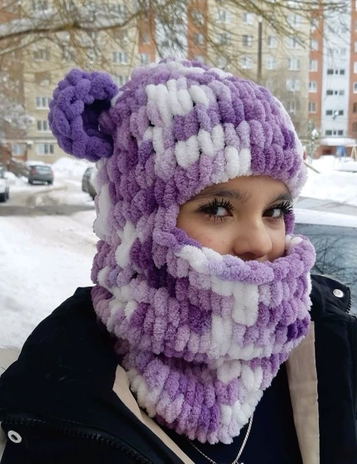Yumuşak ve örgü mor-beyaz iplikten yapılmış kadın bere ve boyunluk seti, sıcak ve şık bir görünüm sunar.