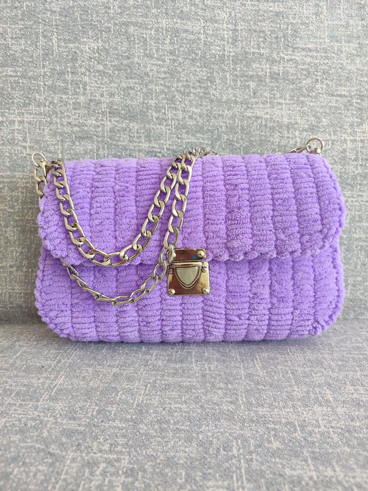 Mor örgü kumaştan yapılmış, altın renk zincir saplı ve tokalı kadın çantası, bohem tarz için uygun.
