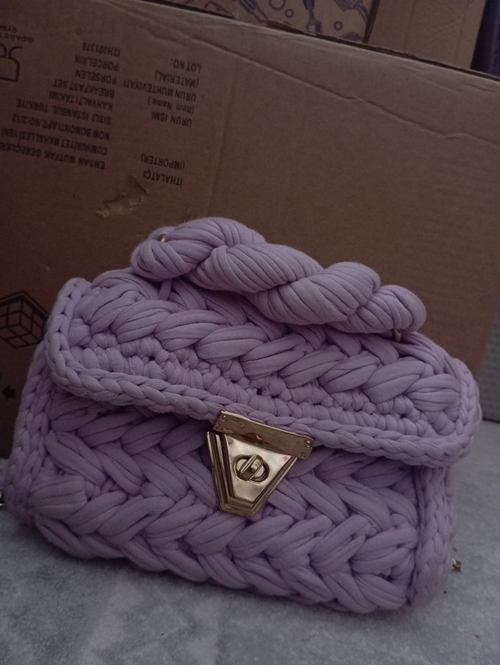 Kalın örgü dokusuyla mor renkli bu çanta, altın renkli tokasıyla günlük kullanıma uygun bohem ve rahat bir stil sunar.