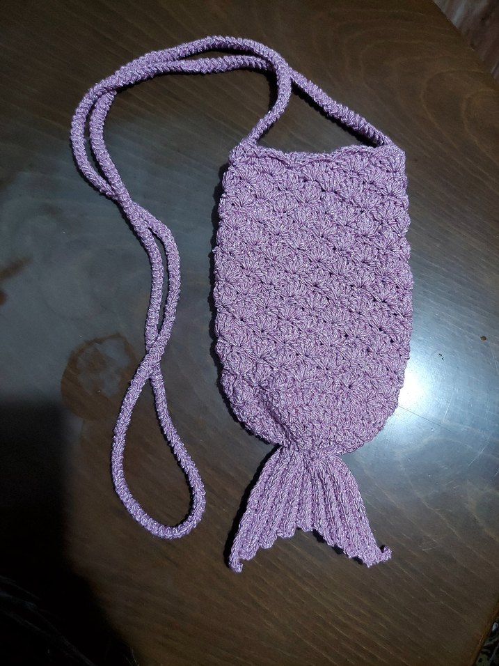 Mor pastel renkli, örgü dokulu ve balık kuyruğu şeklinde tasarlanmış bohem tarzda çapraz çanta.suluk