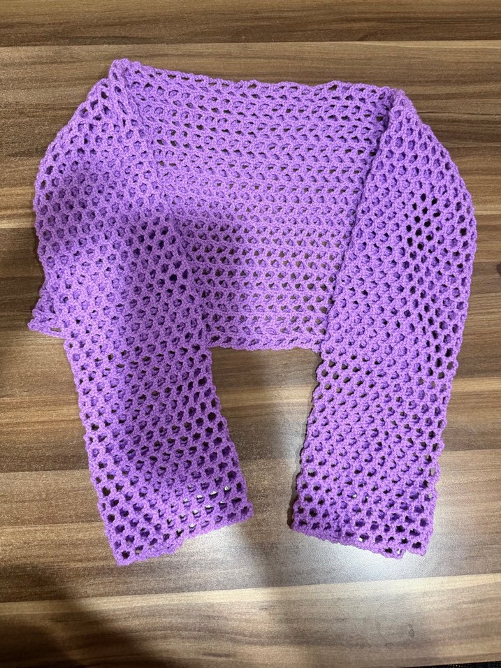 Mor renkli, uzun kollu, gevşek kesim örgü kazak. Açık örgü deseni ve salaş yapısıyla bohem tarzı yansıtır. Günlük kullanıma uygundur.