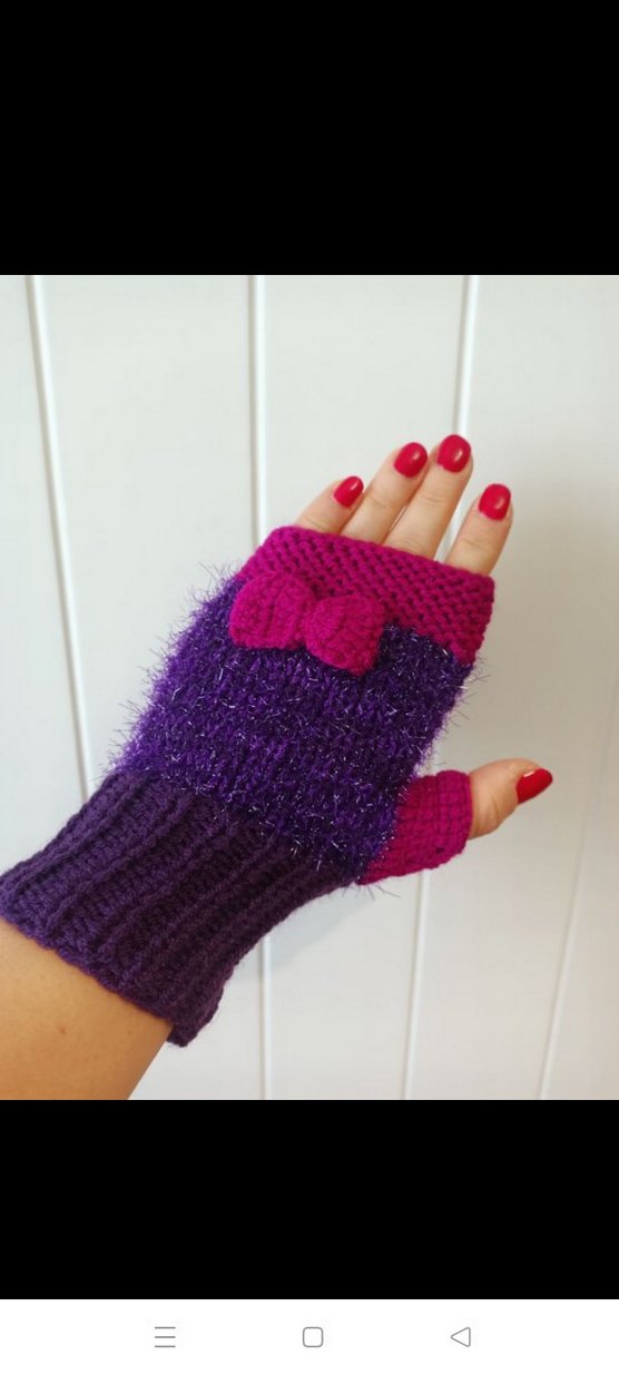 Canlı mor tonlarında, örgü detaylı kadın eldiveni. Rahat dokusu ve süslü fiyonk detayıyla bohem ve retro tarzına uygun.