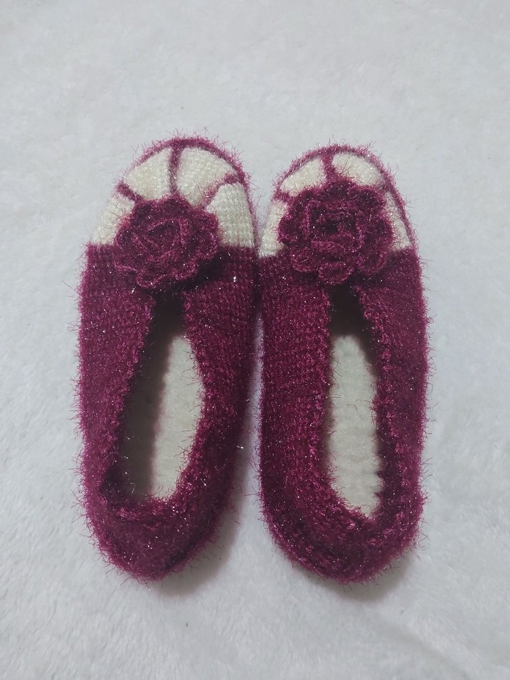 mor renkte, örgü dokulu ve üzeri çiçek detaylı, günlük kullanım için rahat kadın ev terliği. numara 37 .