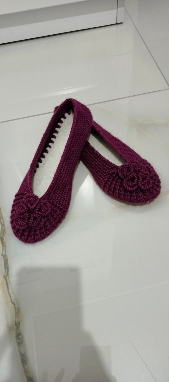 Mor renkli, örgü dokulu kadın ev terliği. İnce topuklu, sade ve rahat tasarımı günlük kullanım için uygundur. Uç kısmında örgü çiçek detayı bulunur.