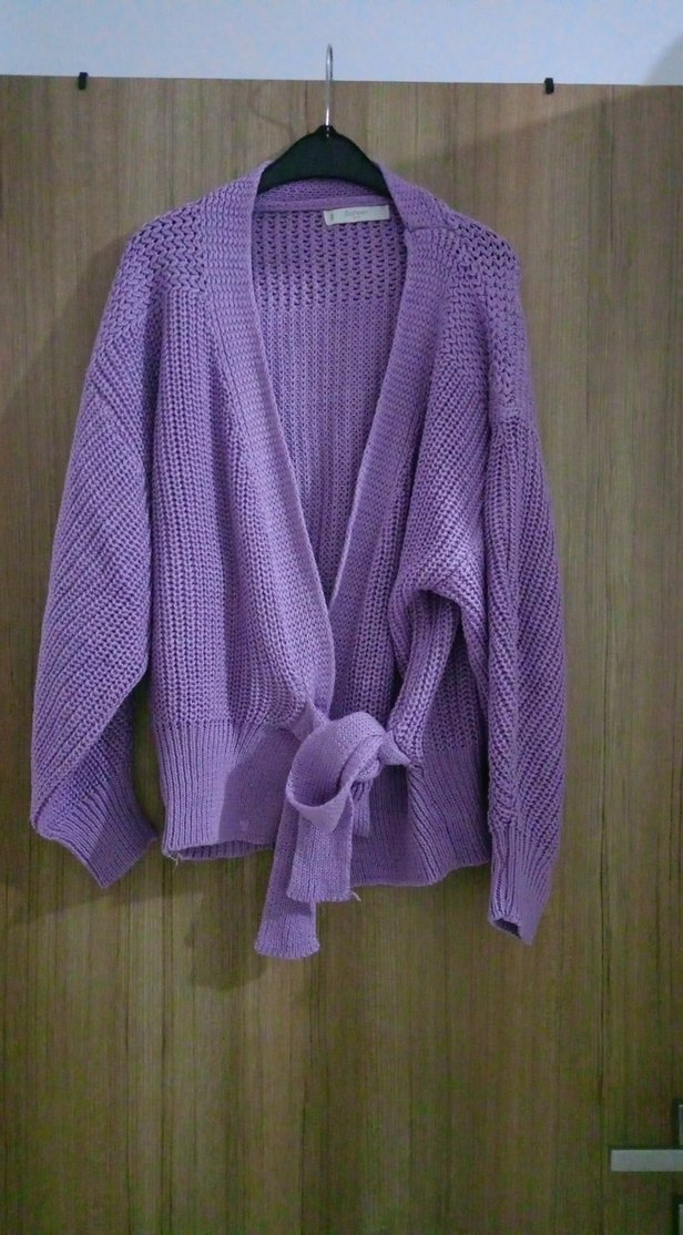 Bol kesim, uzun kollu mor örgü kadın hırka, bağlama kemeri ve yuvarlak yakaya sahip, günlük rahat kullanım için uygun.
