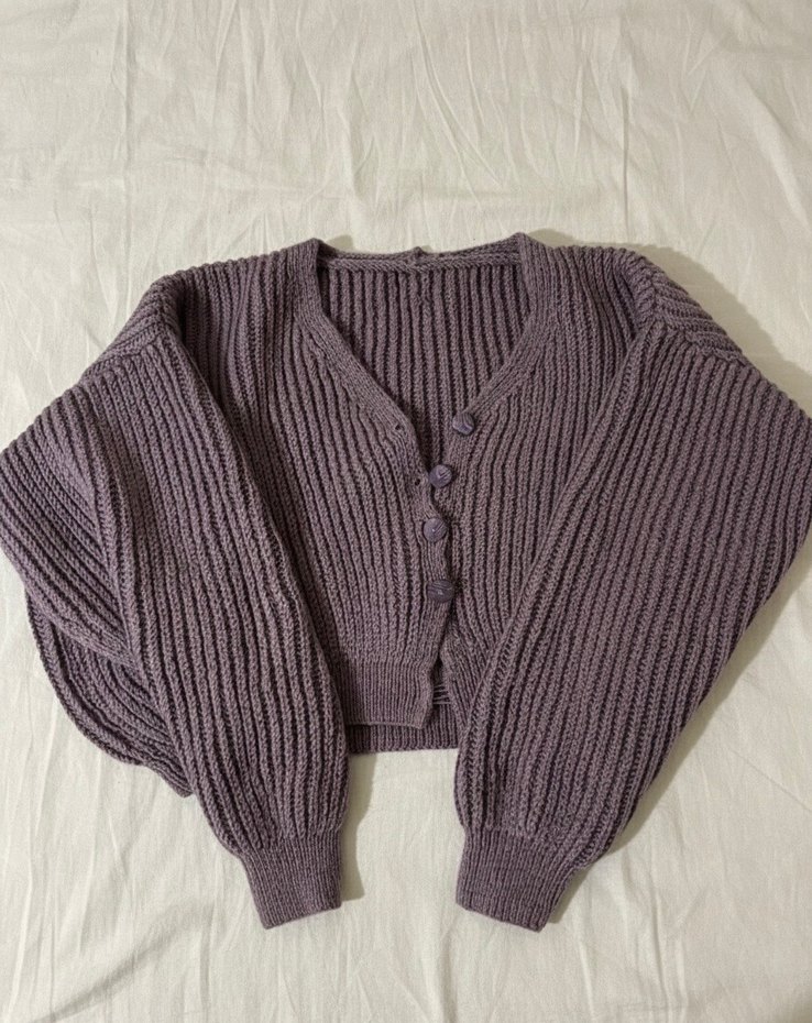 Mor renkte, örgü dokulu, bol kesim, uzun kollu ve kayık yaka kadın hırka. Rahat ve sade bir günlük kullanıma uygun. El örgüsüdür.
