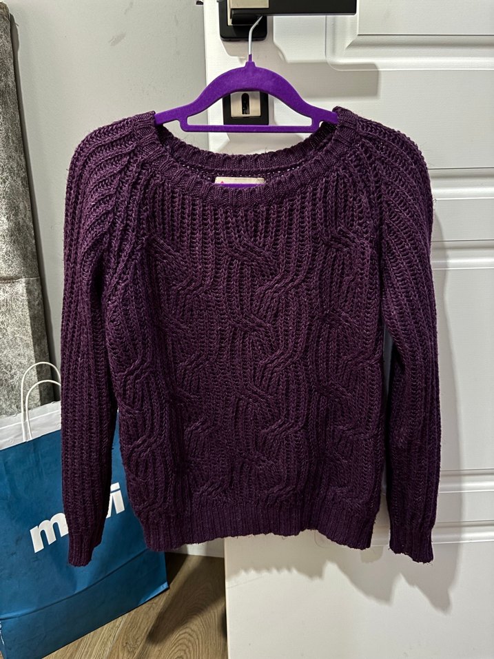 Mor renkli, örgü kumaştan yapılmış, yuvarlak yaka ve uzun kollu, bol kesim, normal uzunlukta kadın kazak. Rahat ve gündelik kullanıma uygun.