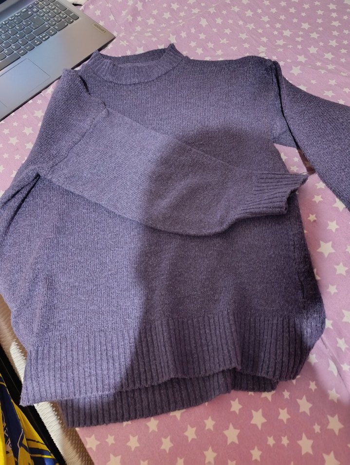 Mor renkli, örgü kumaştan yapılmış, yuvarlak yaka ve uzun kollu, bol kesim kadın kazak. Günlük kullanıma uygun sade ve rahat tasarım.