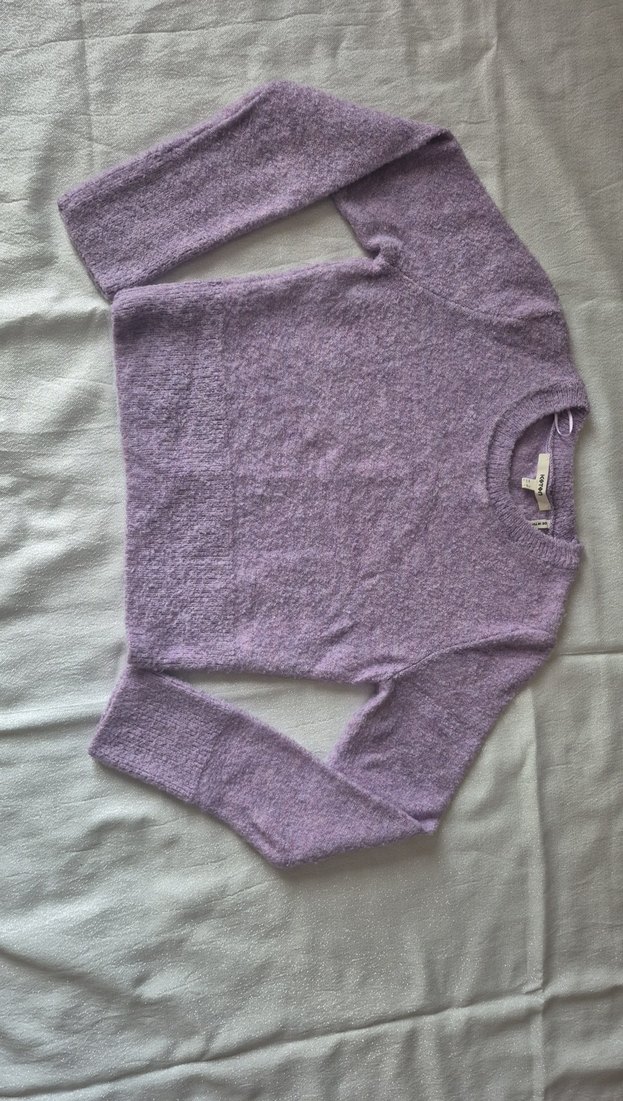 Bu kadın kazak, yumuşak örgü kumaş, bisiklet yaka ve uzun kollara sahiptir. Rahat ve normal boydadır. Pastel mor rengiyle sade, desen içermeyen tasarıma sahiptir.