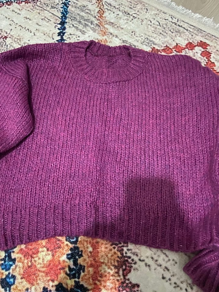 Bu koyu mor örgü kazak, yuvarlak yaka ve uzun kollu, bol kesimiyle rahat ve sade bir günlük stil sunar.