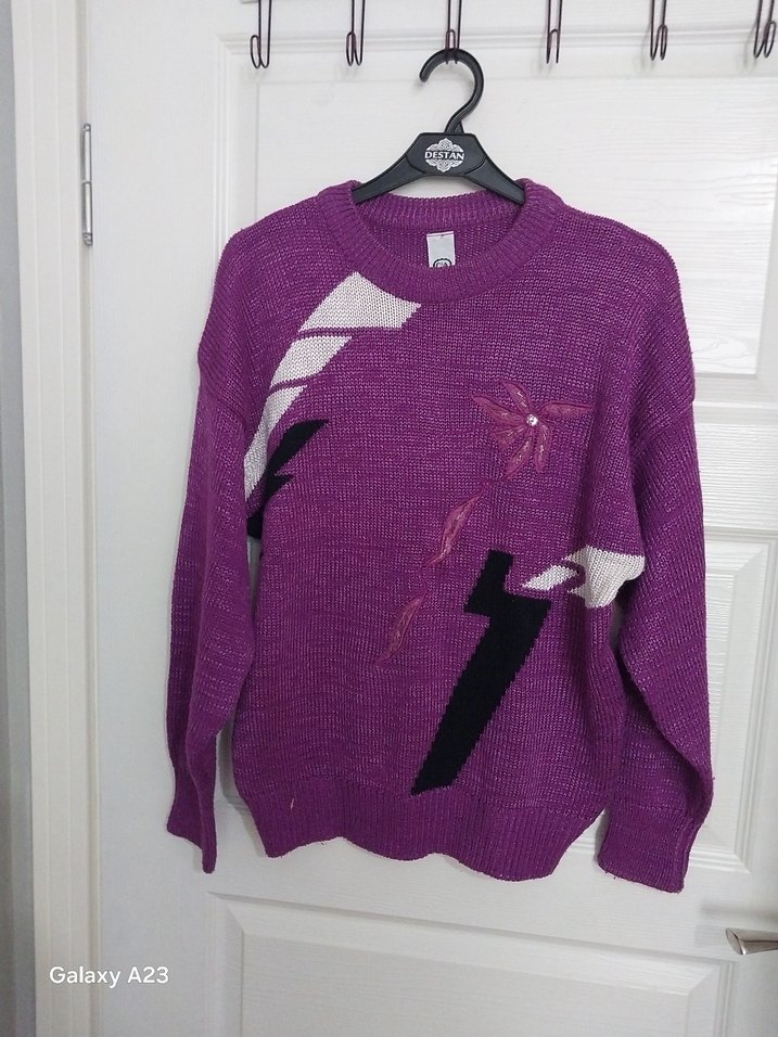 Mor renkli, örgü kumaştan, uzun kollu, bisiklet yaka ve bol kesim kadın sweatshirt. Renkli ve desen içermeyen tasarımıyla günlük ve sokak stiline uygundur.