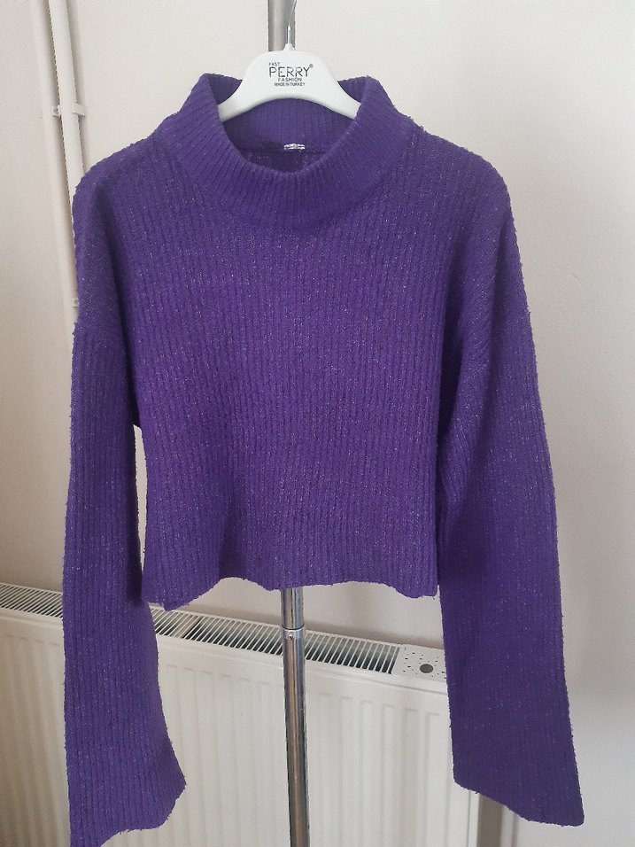 Mor renkli, örgü kadın kazak, bisiklet yaka ve uzun kolludur. Rahat kesim ve midi boydadır, yumuşak örgü kumaştan üretilmiştir. Parlak görünüme sahip, günlük kullanıma uygundur.