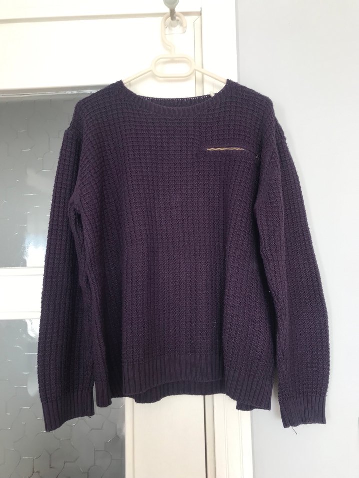 Koyu mor renkli örgü kadın kazak, bisiklet yaka ve uzun kollu, salaş kesimiyle rahat ve şık bir günlük sokak giyimi seçeneği sunar.