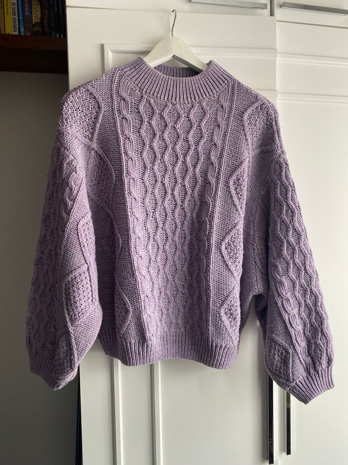 Mor renkli, örgü kadın kazak, uzun kollu ve bisiklet yaka ile rahat kesim sunar. Günlük kullanıma uygun, sade ve konforlu tasarım.