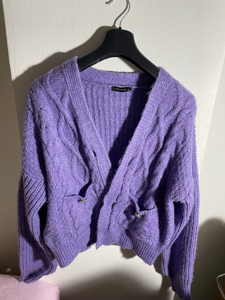 Mor renkli, örgü dokulu, uzun kollu ve yuvarlak yaka, kısa kesim kadın hırka. Rahat ve salaş kesimiyle günlük sokak stili için uygundur.