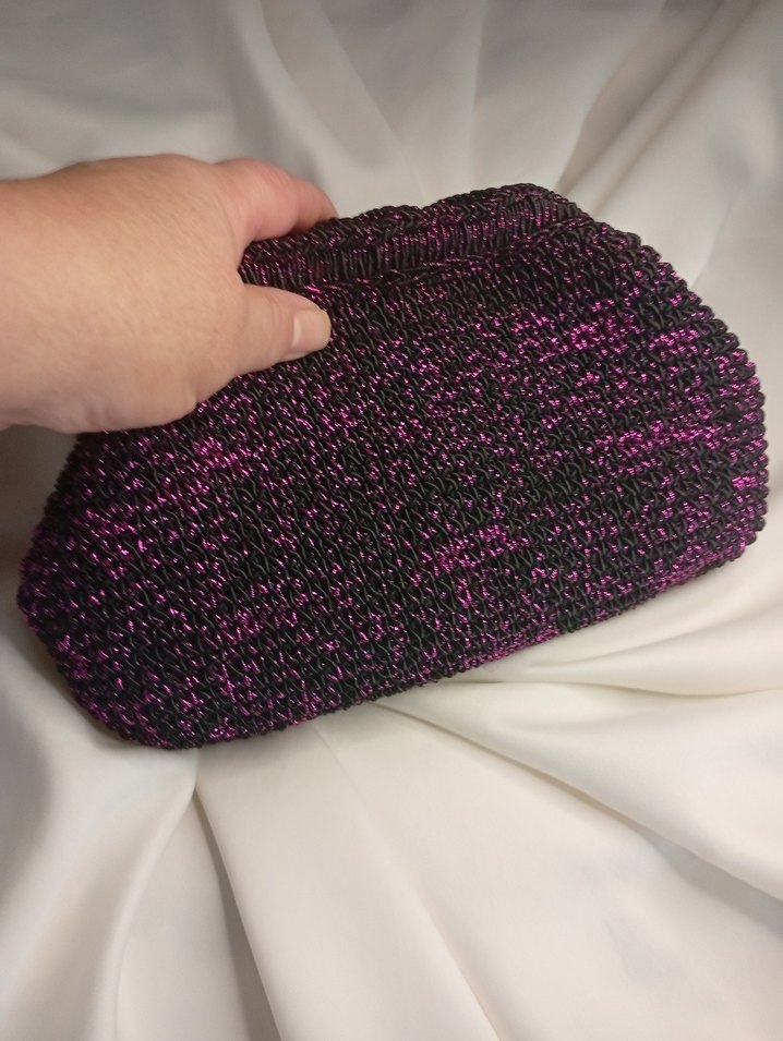 Koyu mor renkte, örgü dokulu kadın portföy çanta. Günlük kullanım için rahat ve avangart bir tarz sunar. Moda öncülerine uygun, karşı kültür stilinde.