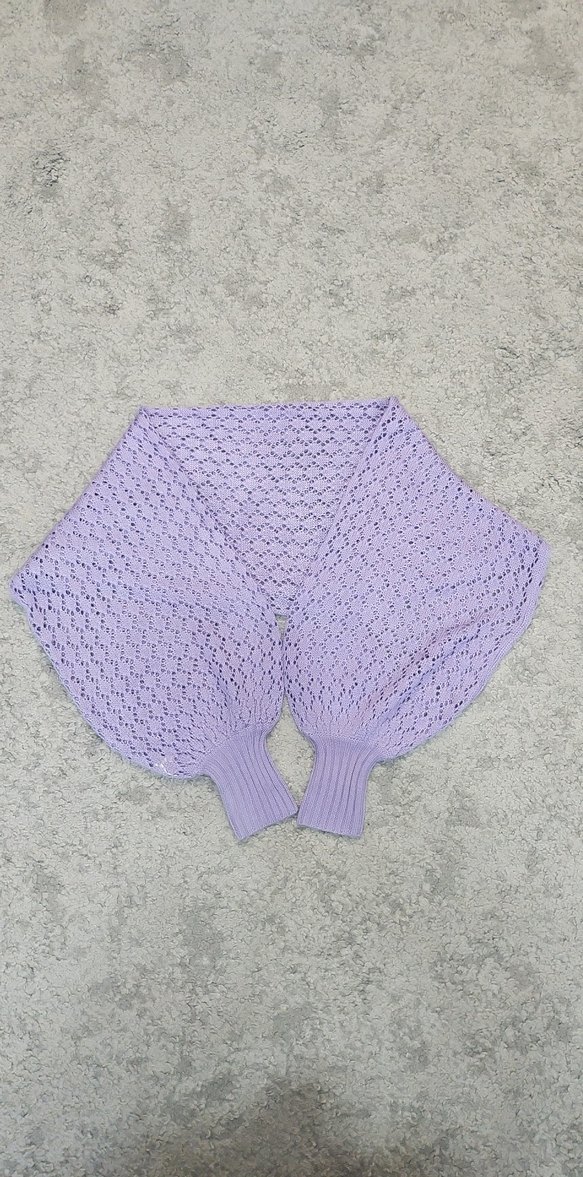 Pastel mor renkli, örgü ve rahat dokusuyla bohem ve retro tarzı kadın şalı, bilek kısmında ribanalı detaylar içerir.