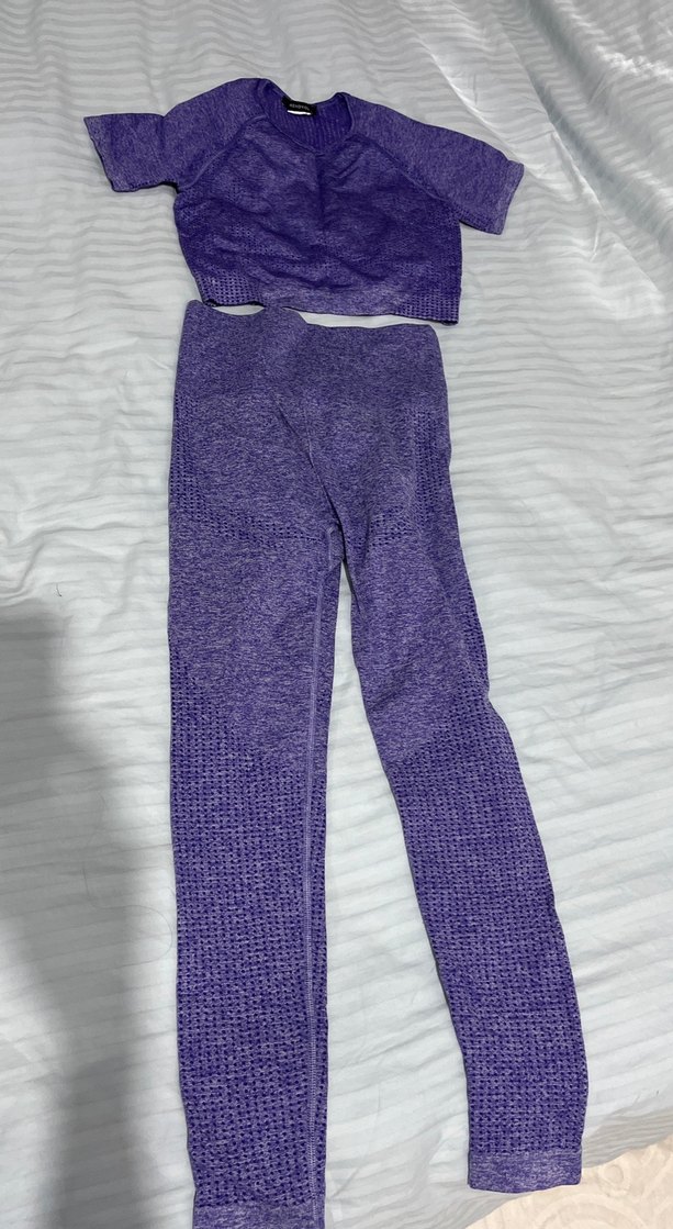 Yumuşak sentetik kumaştan, mor renkli örgü kadın spor tayt takım, bilekte, spor ve sokak tarzı için uygundur. ♀️
