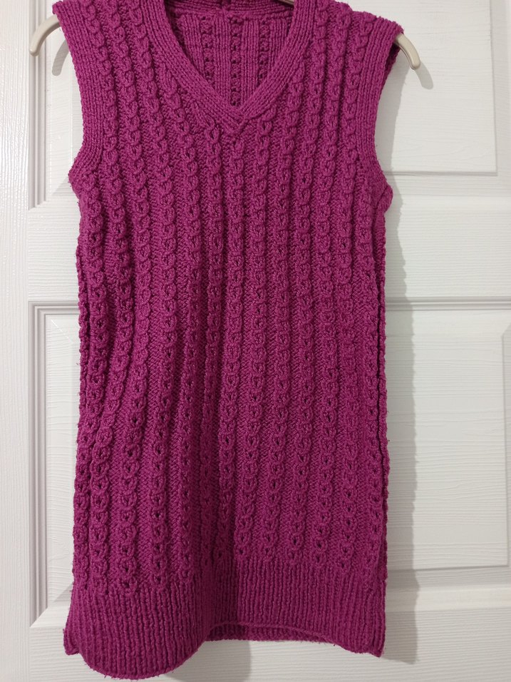 Mor renkli, örgü örme, kolsuz, V yaka ve bol kesim kadın süveter. Rahat ve sade tarzda, günlük kullanıma uygun.