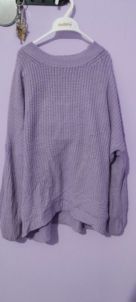Mor renkli örgü triko kazak, uzun kollu ve yuvarlak yakalıdır Ürün m beden ama ben 80 kiloyum tam oluyir üstüme boyu o kadar uzun değil aşağı çektiğimiz için öyle hasar vb yok farklı açıdan fotoğraf atabilirim