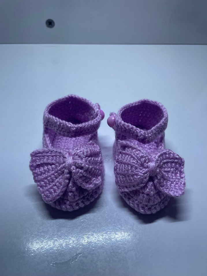 yumuşak iple örülmüş mor fiyonk detaylı sokak stiline uygun bebek patiği