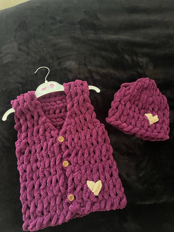 Mor renkli, örgü kız yelek ve şapka takımı, bol kesim ve nakışlı kalp detaylarına sahip. Kolsuz ve yuvarlak yaka stiliyle bohem tarzı yansıtıyor.istenilen renk ölçü model yapılır