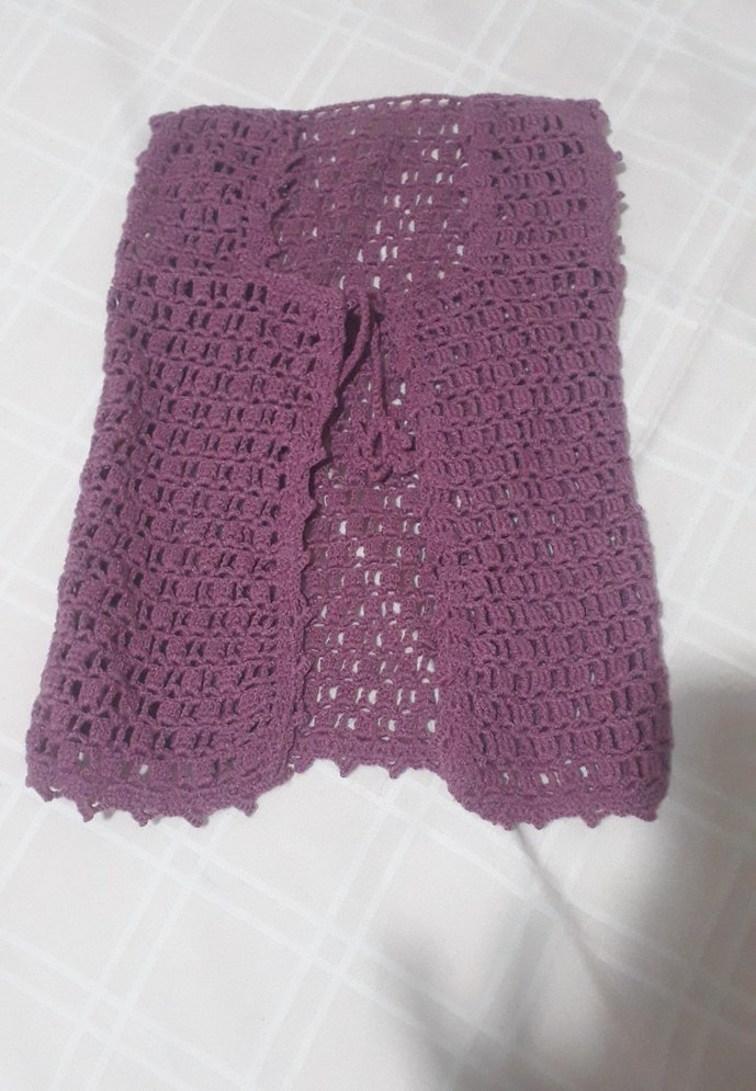Mor renk, örgü kumaştan yapılmış, bohem tarzda, salaş kesim kız çocuk yeleği. Kolsuz ve kayık yaka detaylıdır.