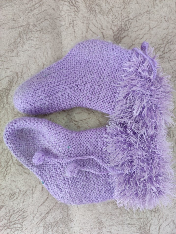 Mor renkte, tüylü manşetli, örgü dokulu kız çocuk ev botu. Bohem tarzına uygun sıcak tutar.