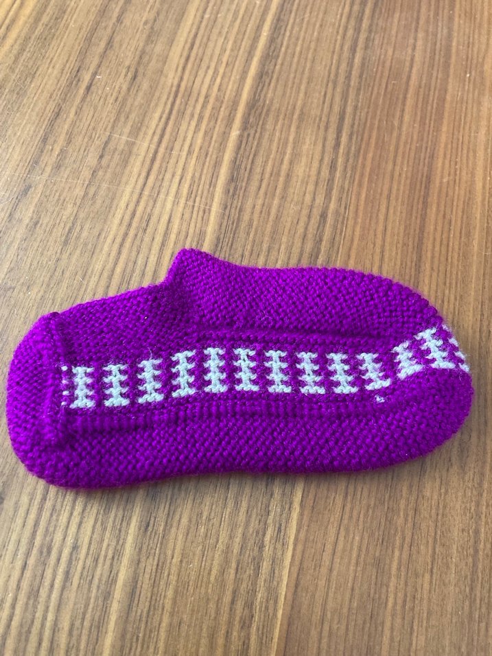 Mor renkli, örgü kız çocuk ev terliği, sade ve klasik tasarıma sahip, renkli çizgi detayı bulunur. Sıcak ve rahat kullanım sağlar. El örgüsüdür. İstenilen desen ve renkte sipariş alınır.