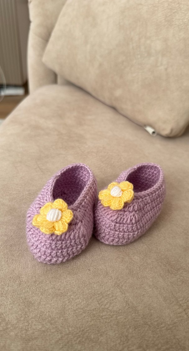Mor örgü kız çocuk patikleri, sarı nakışlı çiçek detaylarıyla renkli ve yumuşak bir dokunuş sunar. yeni doğan içindir çekimlerde kullanılabilir el yapımıdır