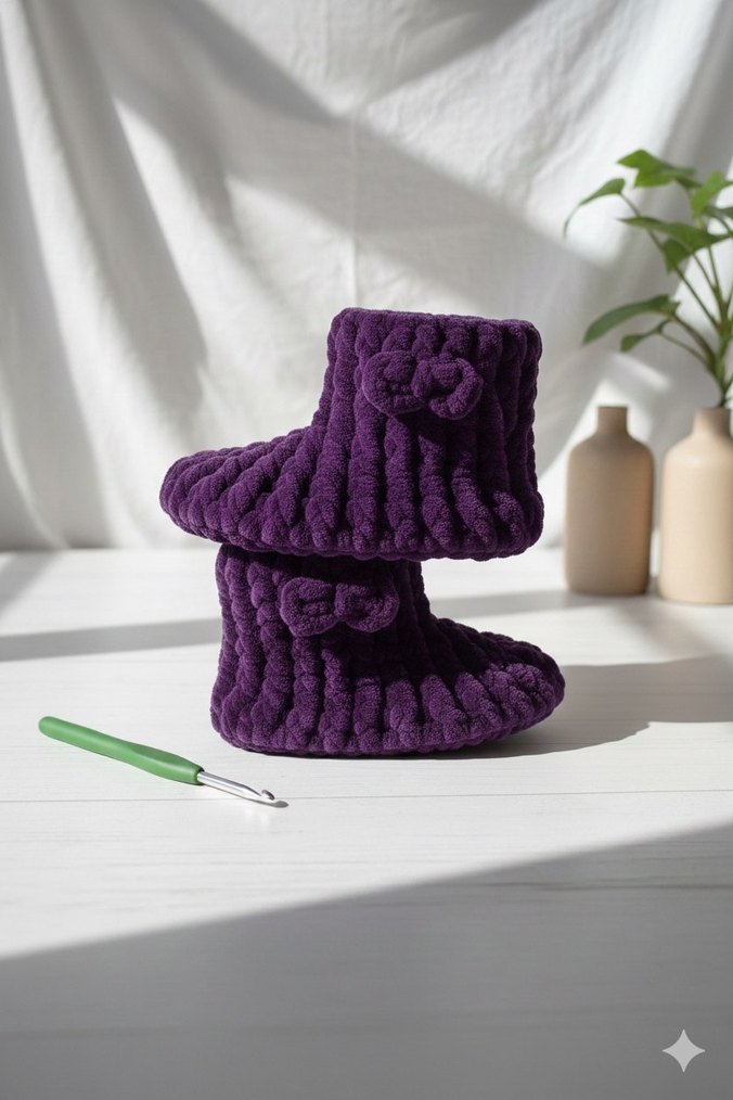 Yumuşak iplikten örülmüş, mor renkte kız çocukları için sıcak terlikler. Dokulu örgü ve küçük fiyonk detayıyla bohem tarzda rahatlık sağlar. Ürün El Örgüsü Olup Sıfırdır. istenilen numara örülür